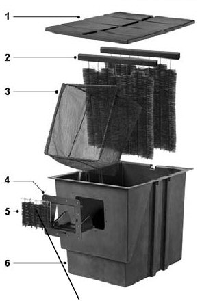 inlaat, vuilopvangnet en draagsteunen voor filterborstels die het onderhoud reduceren. De Satelliet skimmer